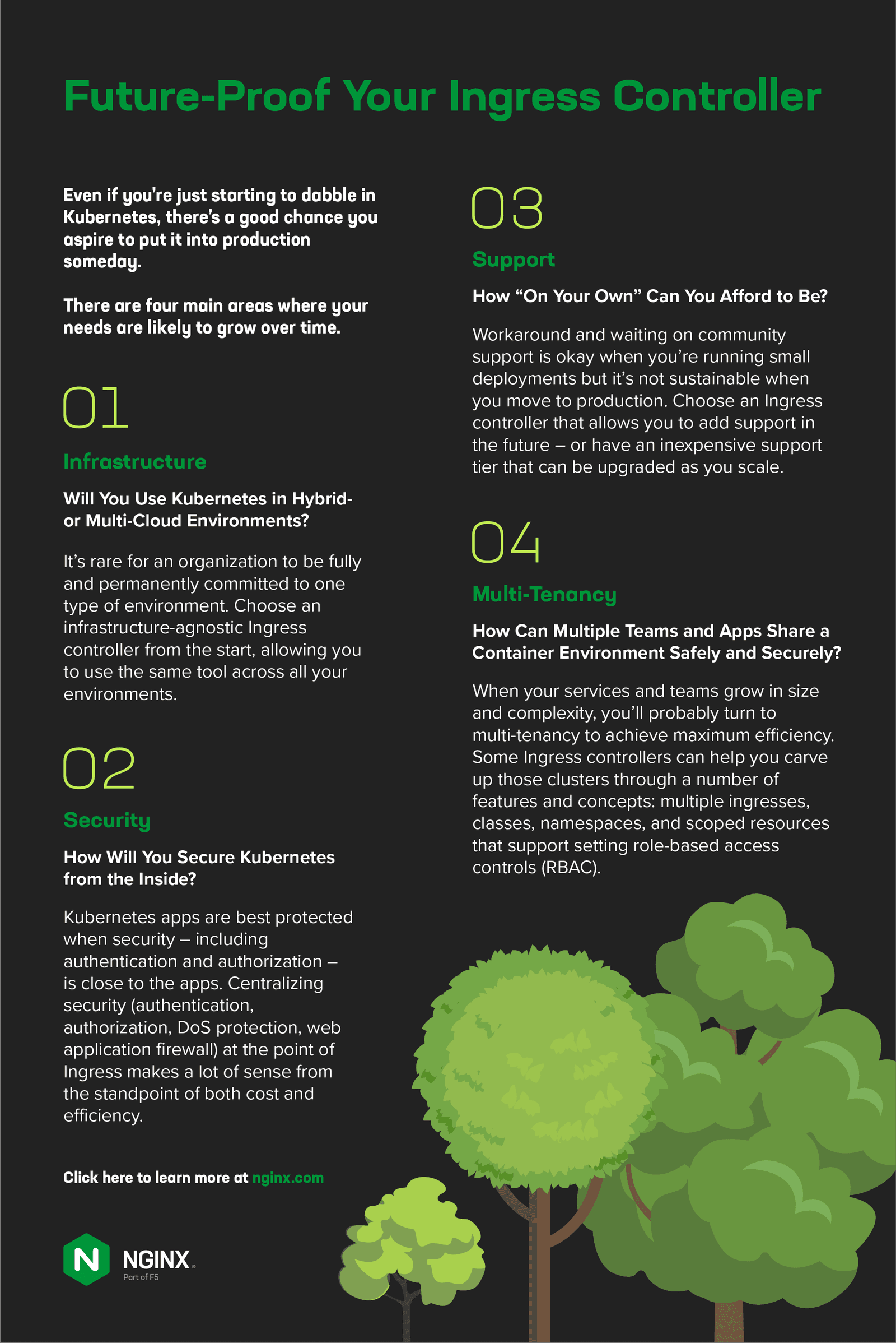 即使您刚刚开始涉足 Kubernetes,也很有可能有一天希望将其投入生产。 您的需求可能会随着时间的推移而增长的四个主要领域是:基础设施、安全、支持和多租户。