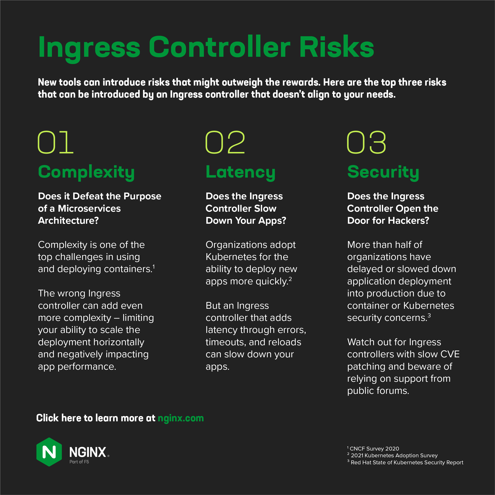 引入 Kubernetes 流量管理工具时,应考虑三个特定风险:复杂性、延迟和安全性。 这些问题往往交织在一起;当一个问题出现时,你很可能会看到其他问题。 每一个都可以由 Ingress 控制器引入,并且由您的组织来决定风险是否可以容忍。 如今的消费者变化无常,任何导致糟糕数字体验的事物都可能是不可接受的,尽管它具有引人注目的功能。