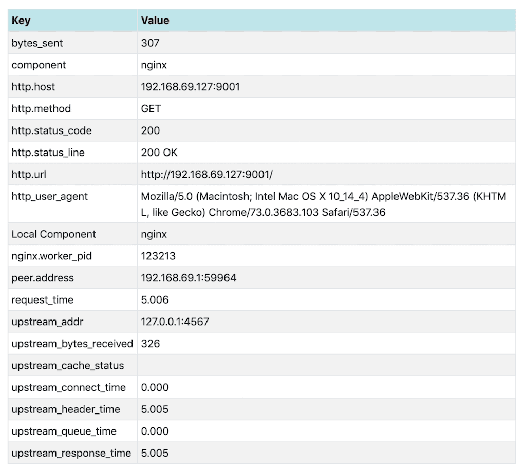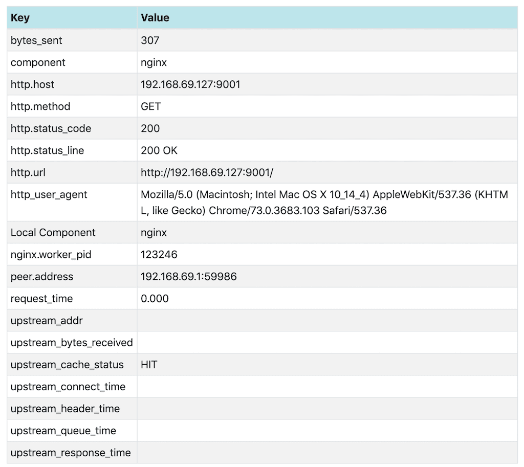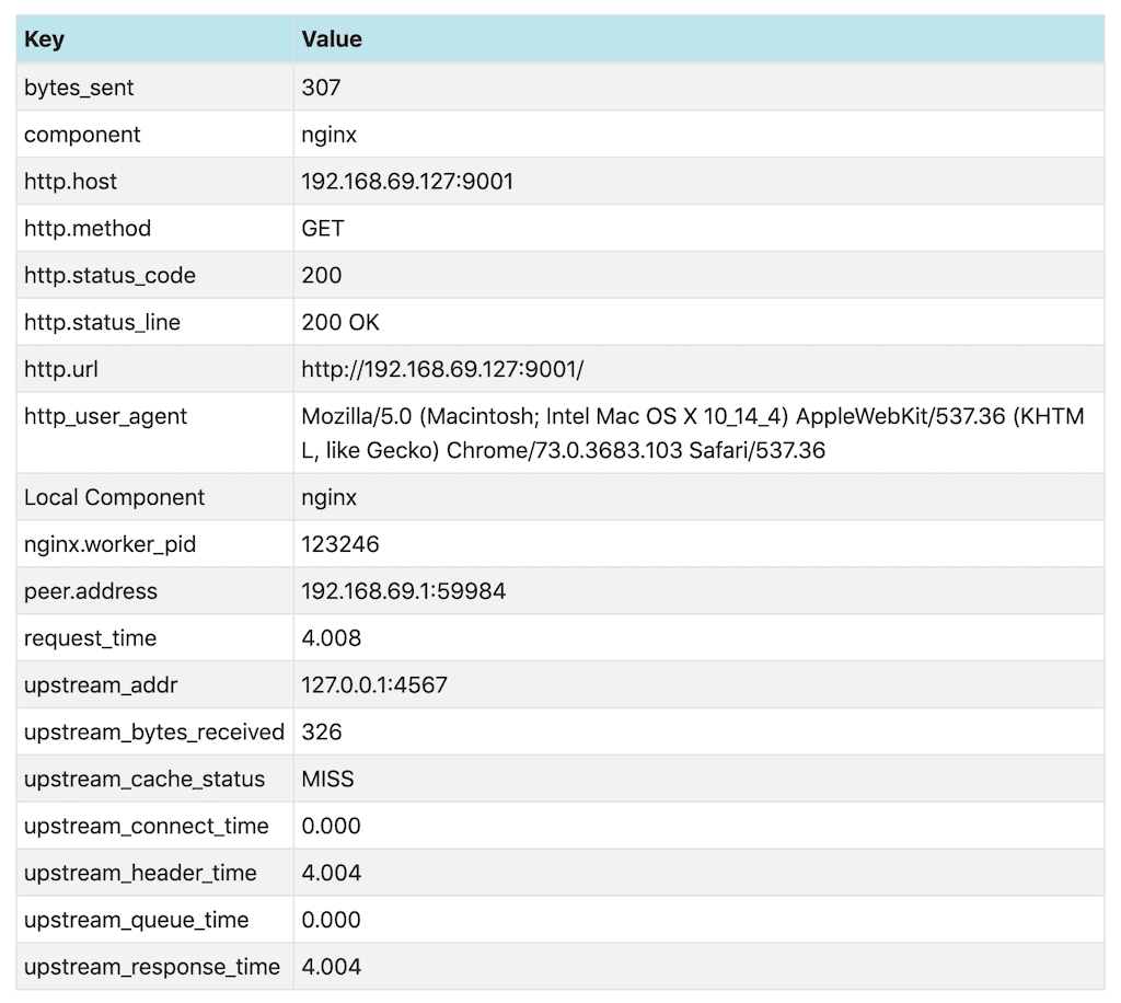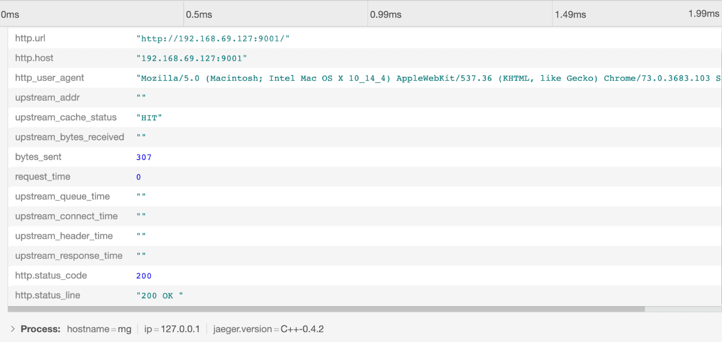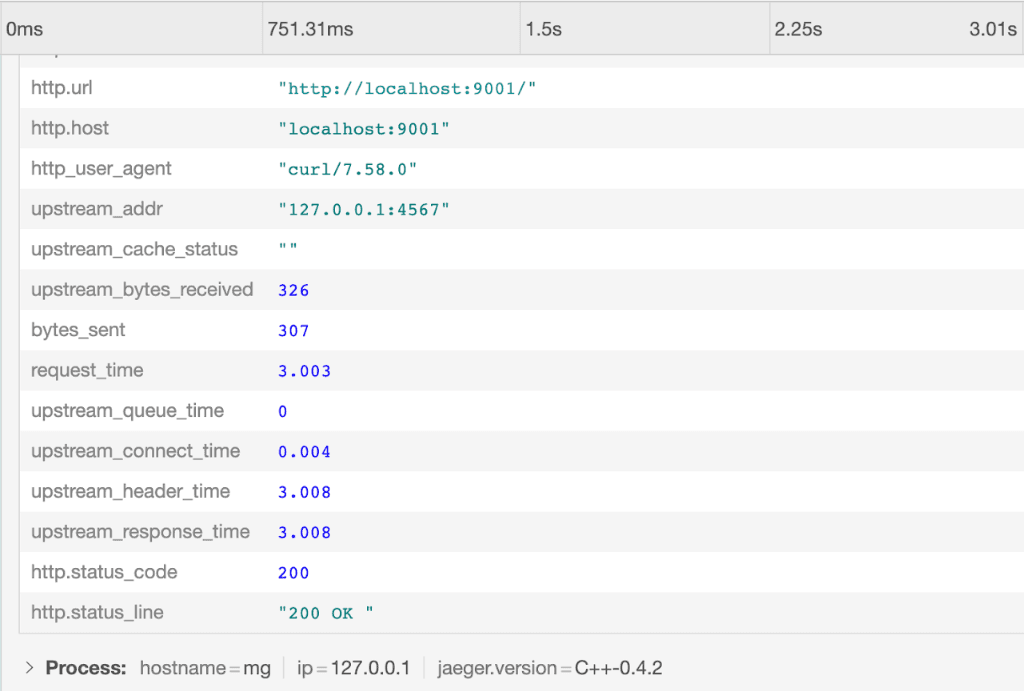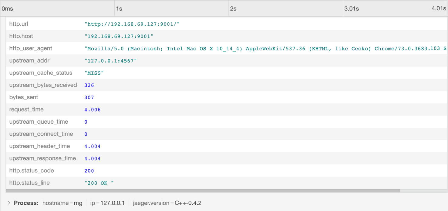 And again looking at the two requests in detail explains the difference in response time. The response is not cached for the first request (upstream_cache_status is MISS) and the Ruby app (coincidentally) adds the same 4-second delay as in the Jaeger example.