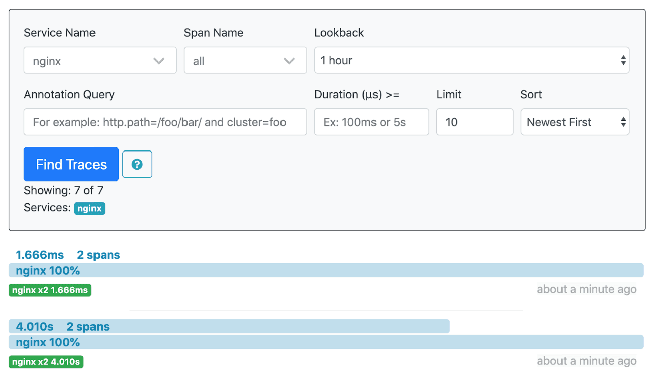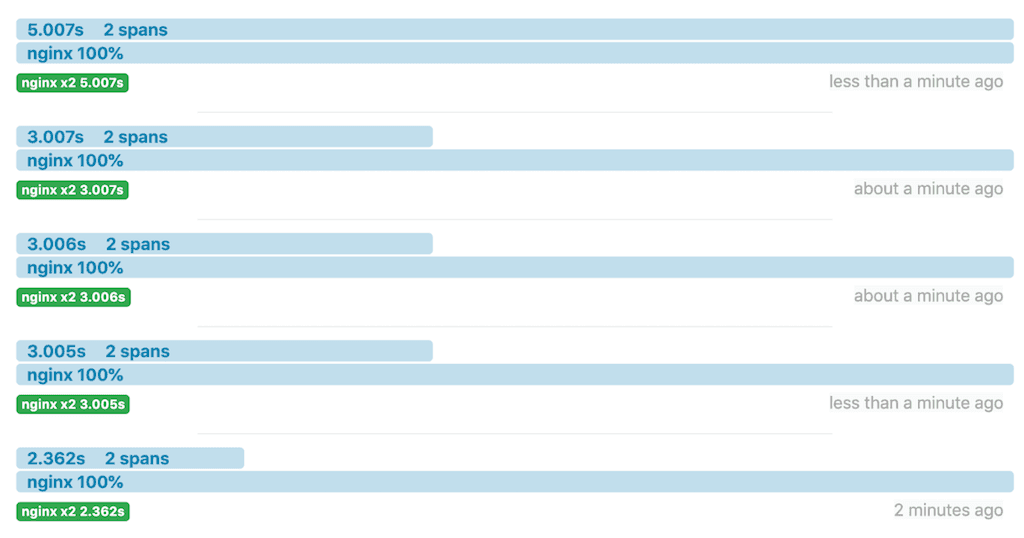 We use Jaeger and Zipkin to show how long it takes NGINX Plus to respond to a request when caching is not enabled. For each tracer, we send five requests.