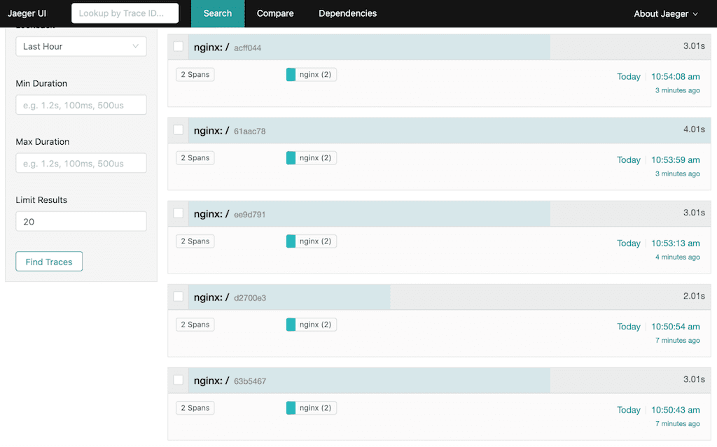 Here are the five requests displayed in the Jaeger UI (most recent first):