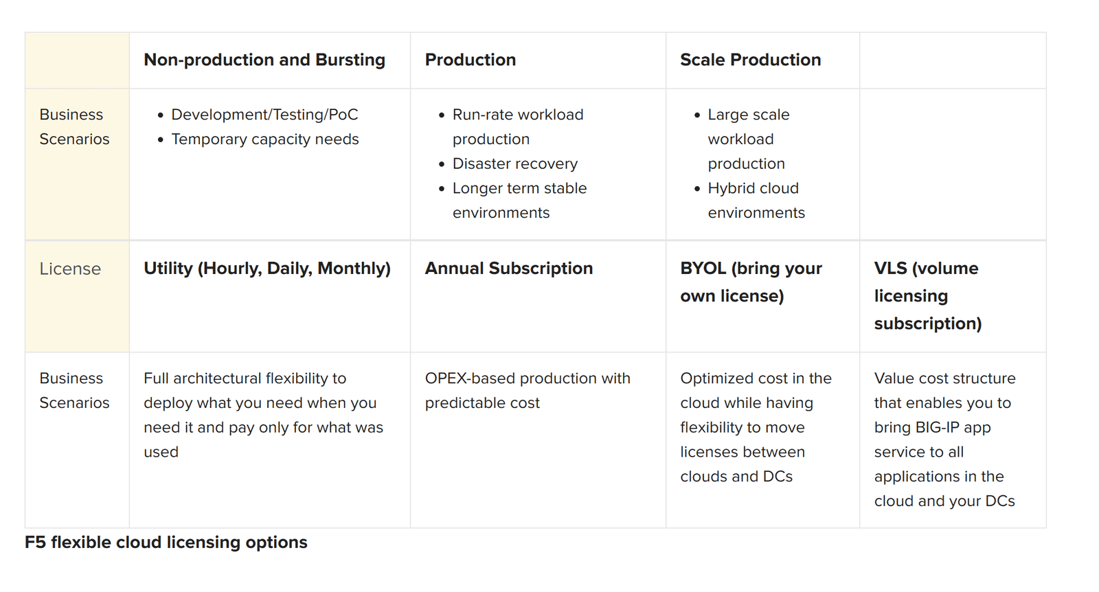 BIG-IP virtual editions are available in Good-Better-Best bundles in utility billing (hourly, daily, monthly), annual subscription, bring-your-own-license (BYOL), and Volume Licensing Subscription models. For test/development pre-production workloads or temporary cloud bursting and scalability use cases, F5 offers utility licensing that provides flexibility and on-demand use (pay for only what you use, after you use it).